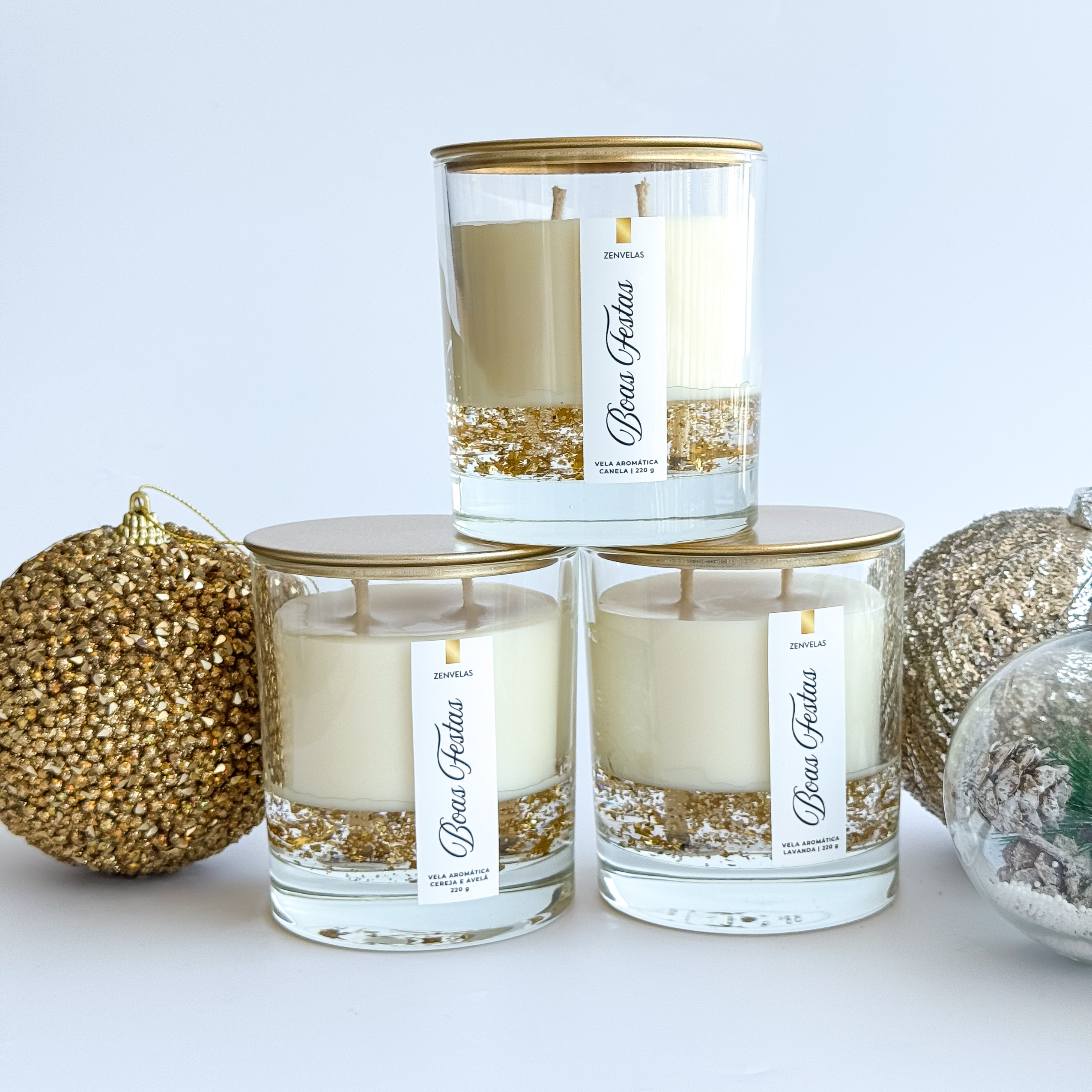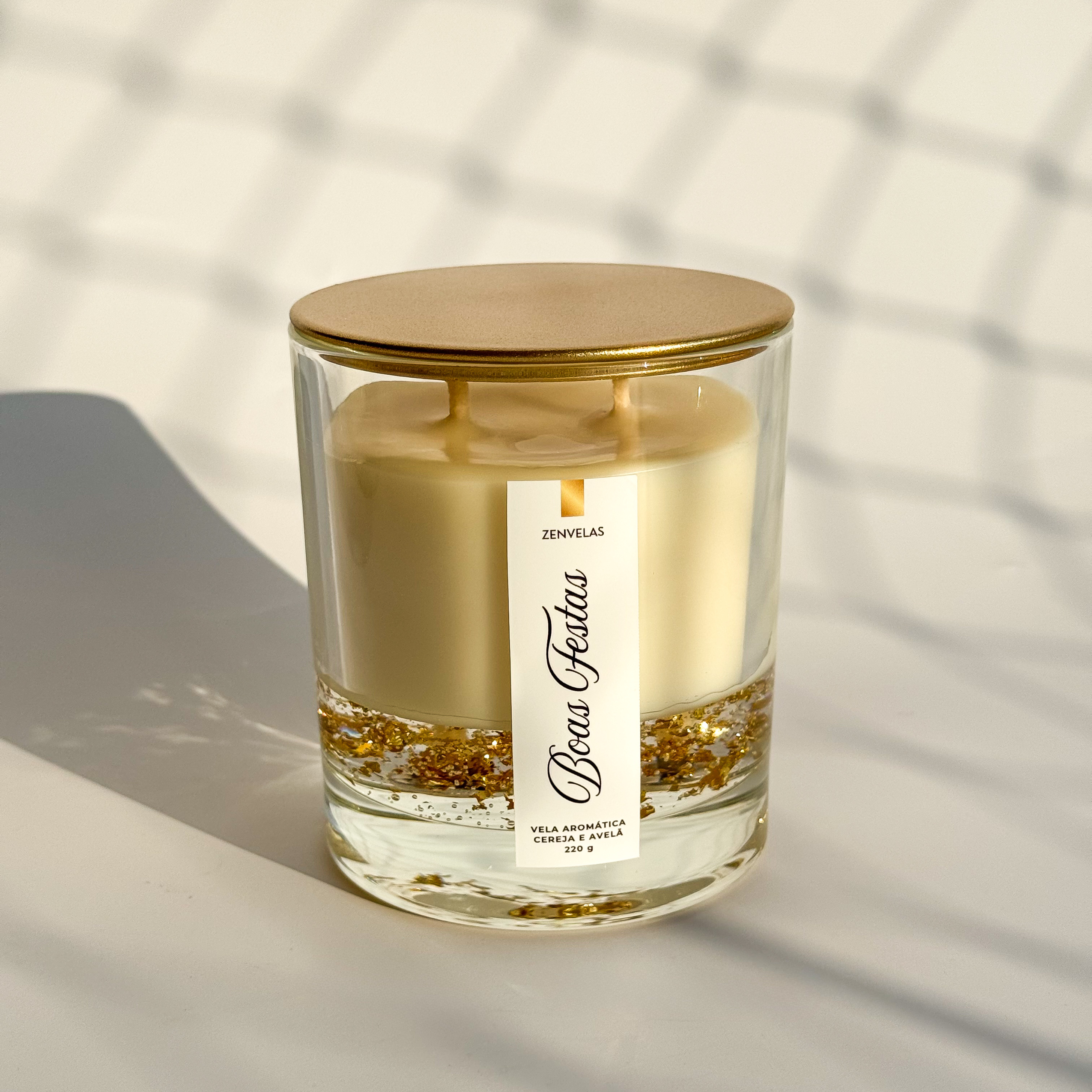 Composição: cera vegetal de coco, essências premium e pavio 100% algodão. A base transparente com folhas de ouro é em parafina.